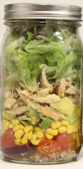 Limpiar bien el tarro y echar primero un dedo de aliño de mostaza, luego los tomates cherry, la cebolla roja, el maíz en grano, el aguacate, el pollo, las hojas de lechuga y , por último, las pipas.