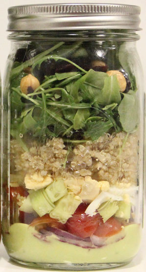 Limpiar bien el tarro y echar en el fondo un dedo de aliño de aguacate, luego ir añadiendo primero los tomates cherry, la cebolla roja y el pepino. Luego el huevo duro. Seguidamente la quinoa cocida. Encima, las hojas de rúcola. Por último, los arándanos secos y las avellanas.