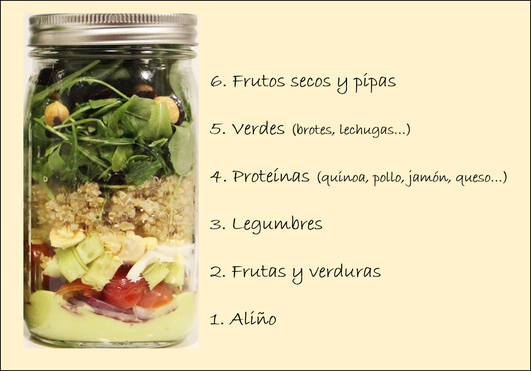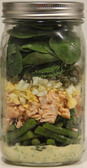 Limpiar bien el tarro y colocar en el fondo un dedo de aliño de mostaza y miel. Luego añadir los espárragos cocidos o salteados, el salmón cocido en el horno o al vapor (10 minutos), el huevo duro, las alcaparras y, por último, las espinacas frescas lavadas.