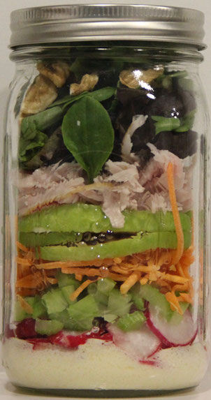 Limpiar bien el tarro y echar en el fondo el aliño de yogur. Luego, ir colocando los rábanos en lonchas finas, el apio troceado, la zanahoria rallada, los gajos de manzana remojados en el zumo de 1/2 limón, el pavo natural cortado en tiras, los brotes de lechuga y, por último, las nueces peladas.