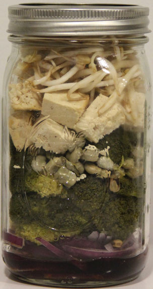 Limpiar bien el tarro y echar el aliño en el fondo. Seguidamente colocar las cebolleta roja cortada en aros finos, el brócoli cocido al vapor, las habitas tiernas, el tofu salteado y, por último, los brotes de soja tiernos.
